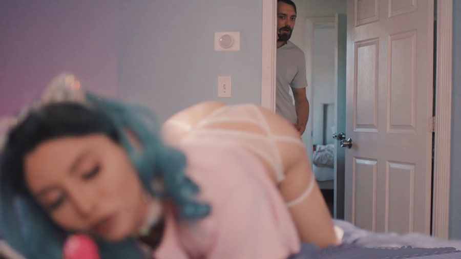 Busty shemale lets her guy neighbor come to her house and watch her while shes toying her tight ass using dildo.After that,she lets him put his dick inside her ass and she then throats it and puts it back.