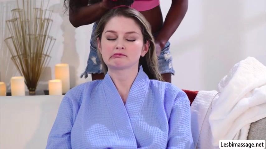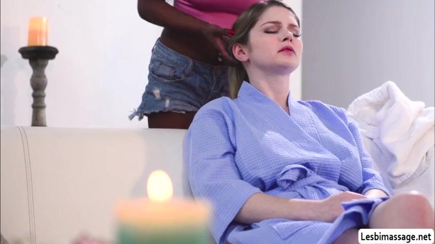 Busty ebony gives her broken hearted friend a free massage in her house.After that,she gets horny and starts rubbing the tits of her friend.Next is,she goes down and she then licks the pink pussy of her friend.