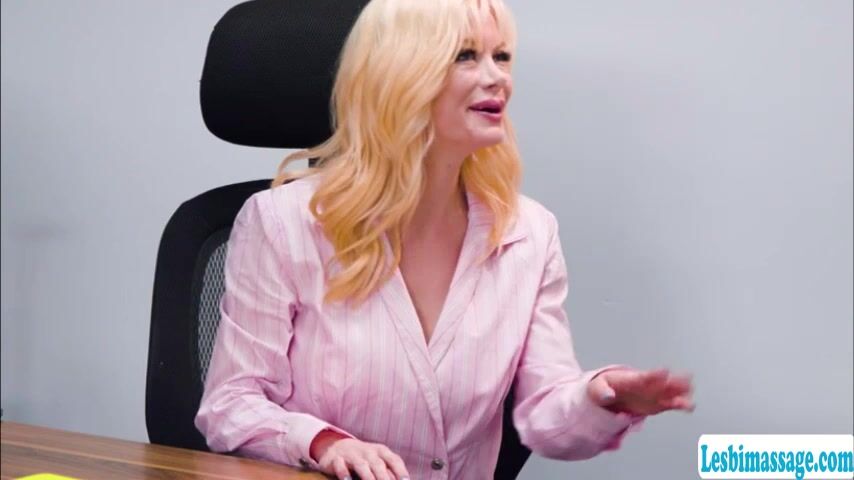 Description: Milf blonde gives her beautiful secretary a shoulder massage because she looks so tired.After that,her hands slowly touching her secretarys tits and they kiss each other passionately.Next is,she lets her secretary bend over and she then licks her pussy