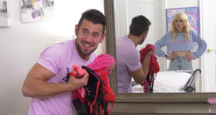 Description: From a distance, masculine hunk stud Dante Colle is eyeing his new sexy blonde tranny babe Kate Zoha that he sneaks in and sniffs her underwear in the closet. But she finds him and teases him with sweet kisses until they moved in bed where she suck and rides his cock.