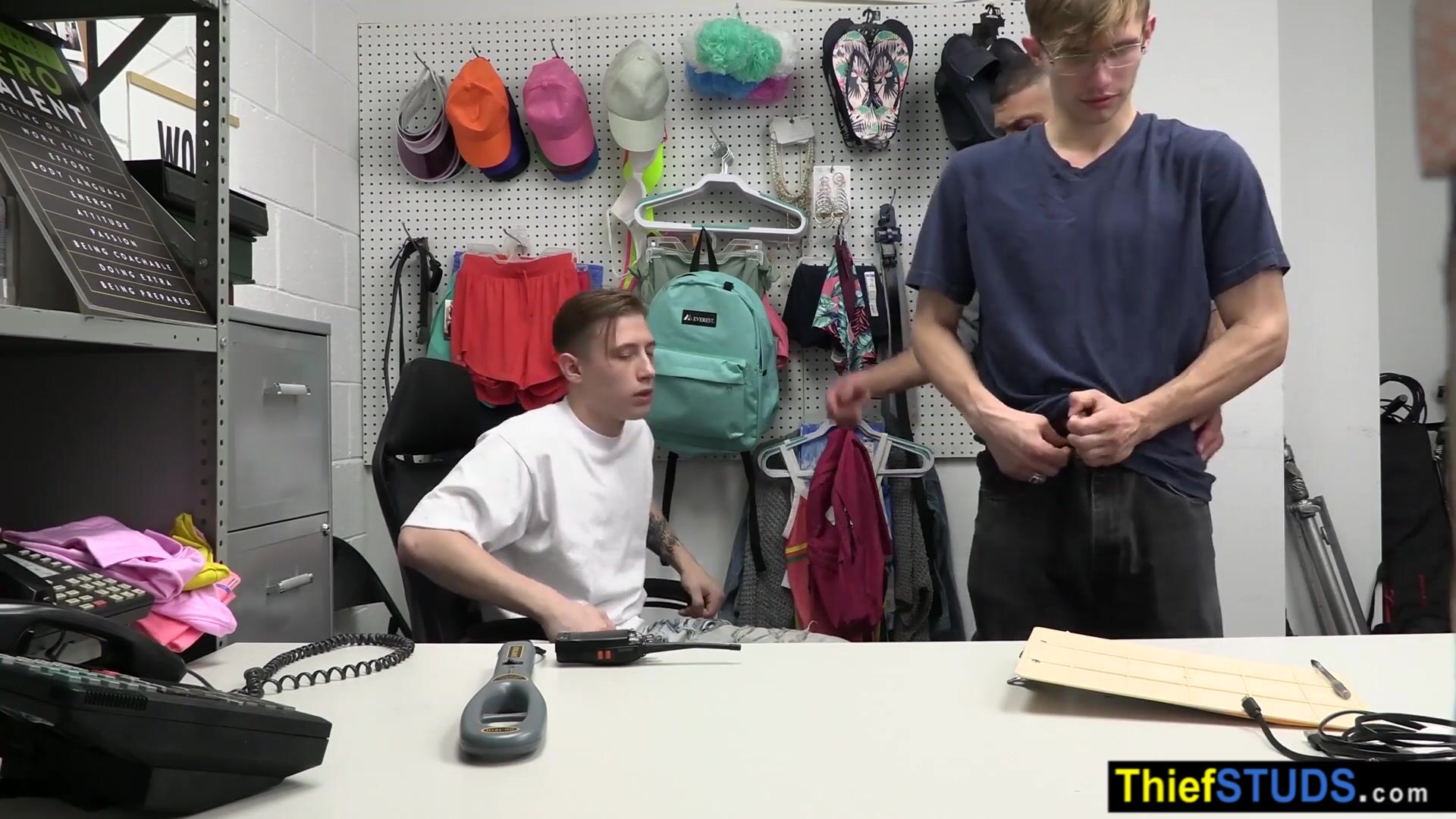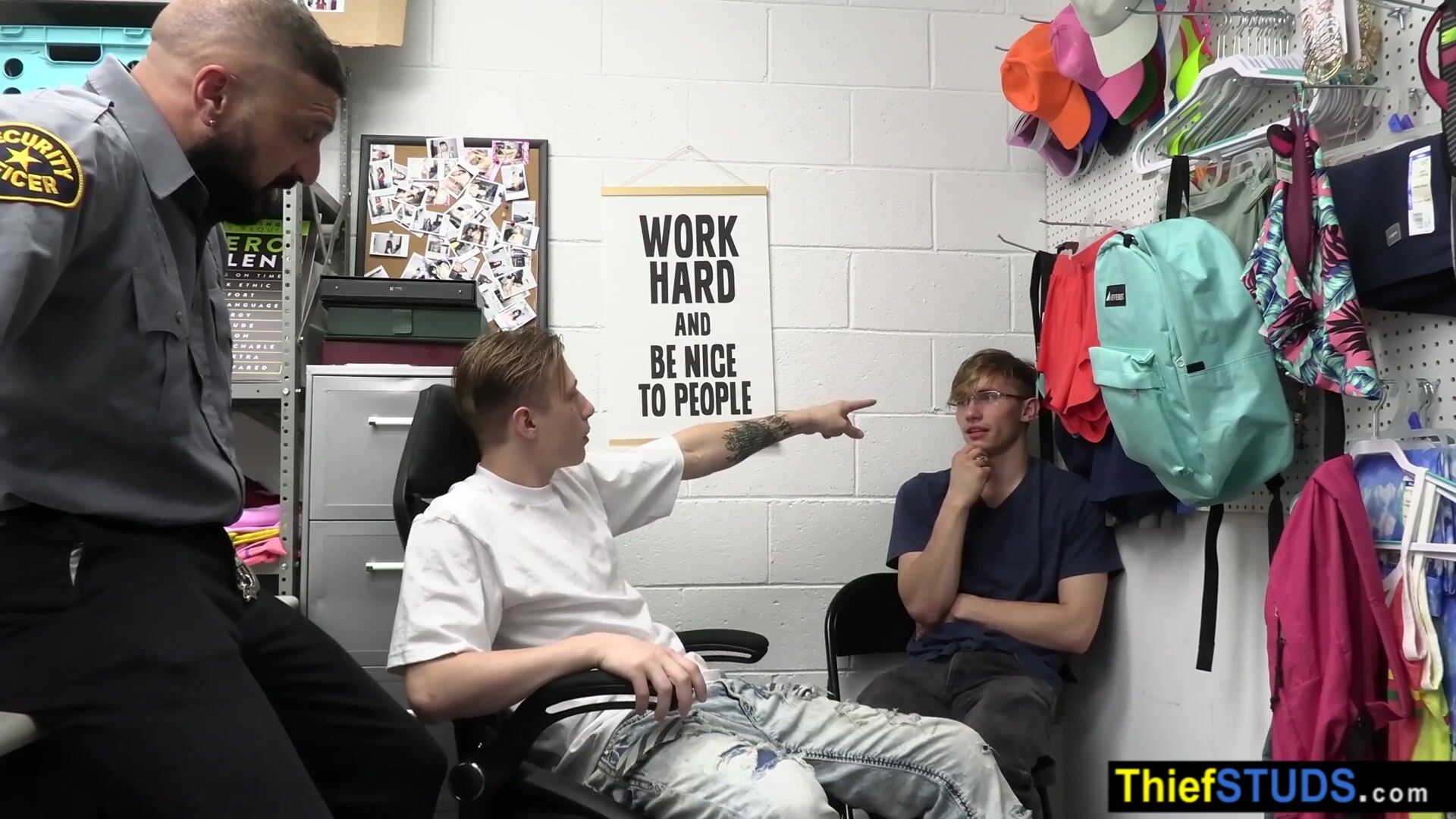 Description: Security officer Marco Napoli brings two suspected perps Adam Awbride and Cole Church into the backroom after strip seach he ordering them to satisfy his big cock bareback after a blowjob he is fucking them during the teens sucking each others dicks