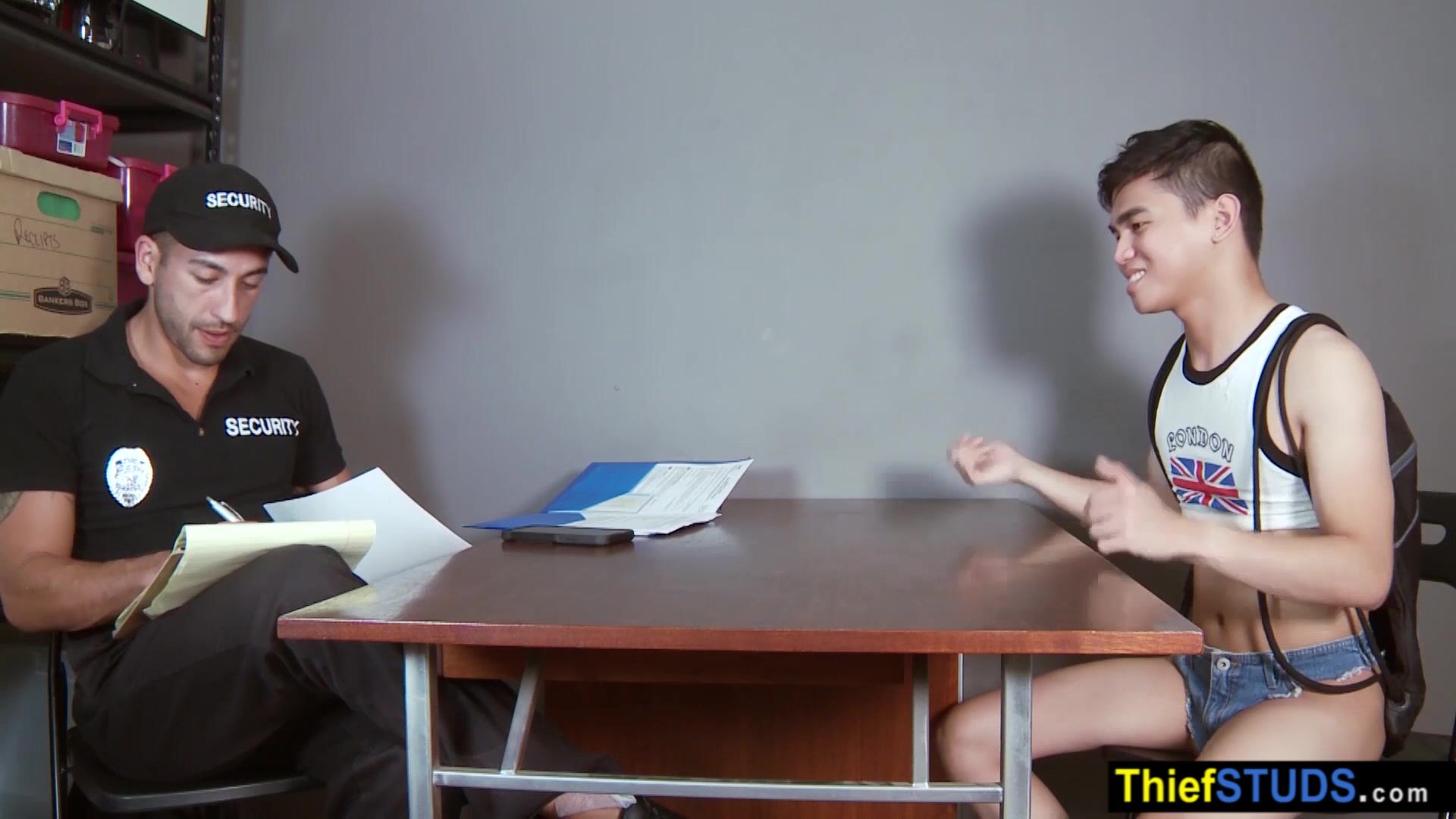 LP officer brings asian teen perp Gavin Winters to the backroom to speak with him about his attire who agrees to let him use his body as he pleases if it keeps him from involving the cops He is sucking his big cocked the officer fucking him bareback