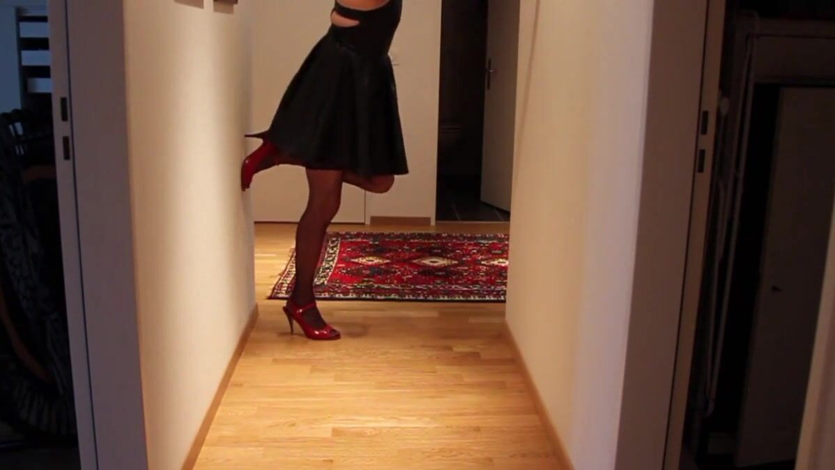 Description: Dressed in Leather skirt and red high heels, play till cum. New suspender. Riding my dildo at the final