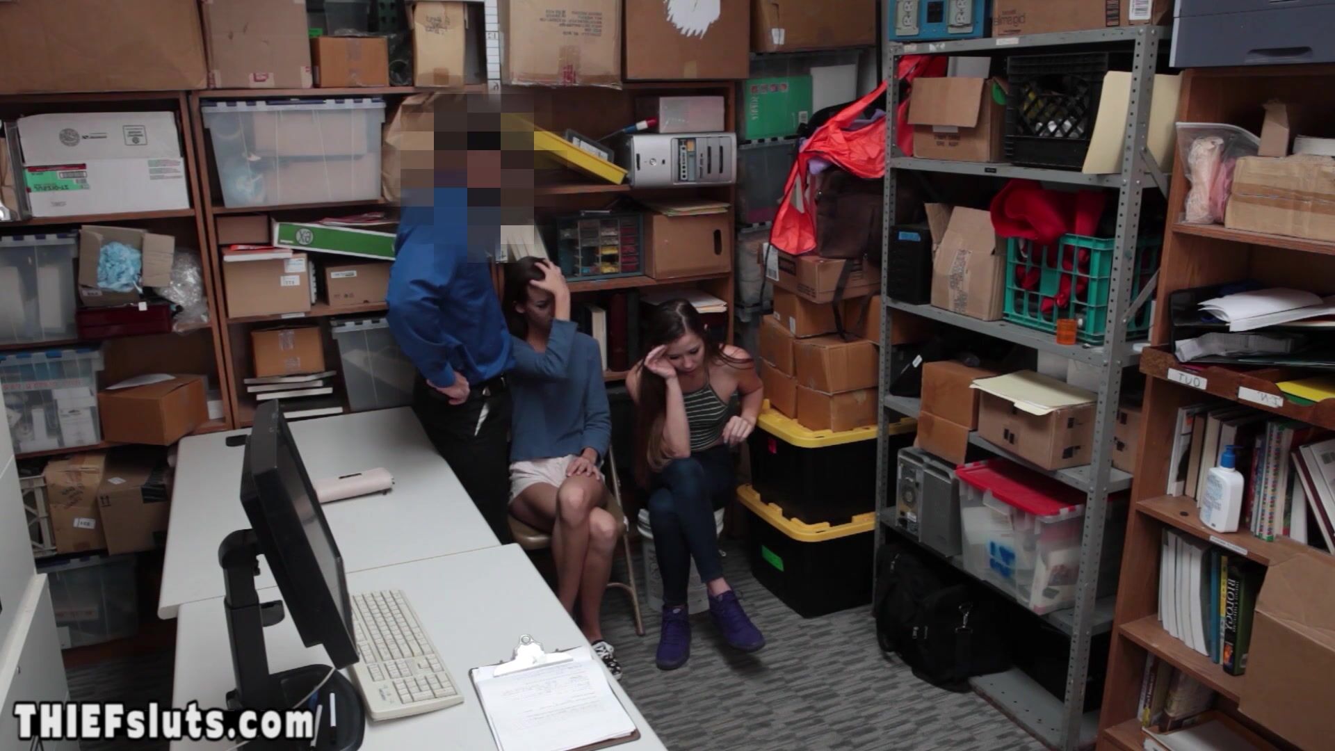 Skinny brunette arrogant teen shoplifter Charity Crawford with small tits and her GF Zoey Laine got caught by a dirty LP officer who ordered them to suck his big dick then he fucked the petite sluts hard