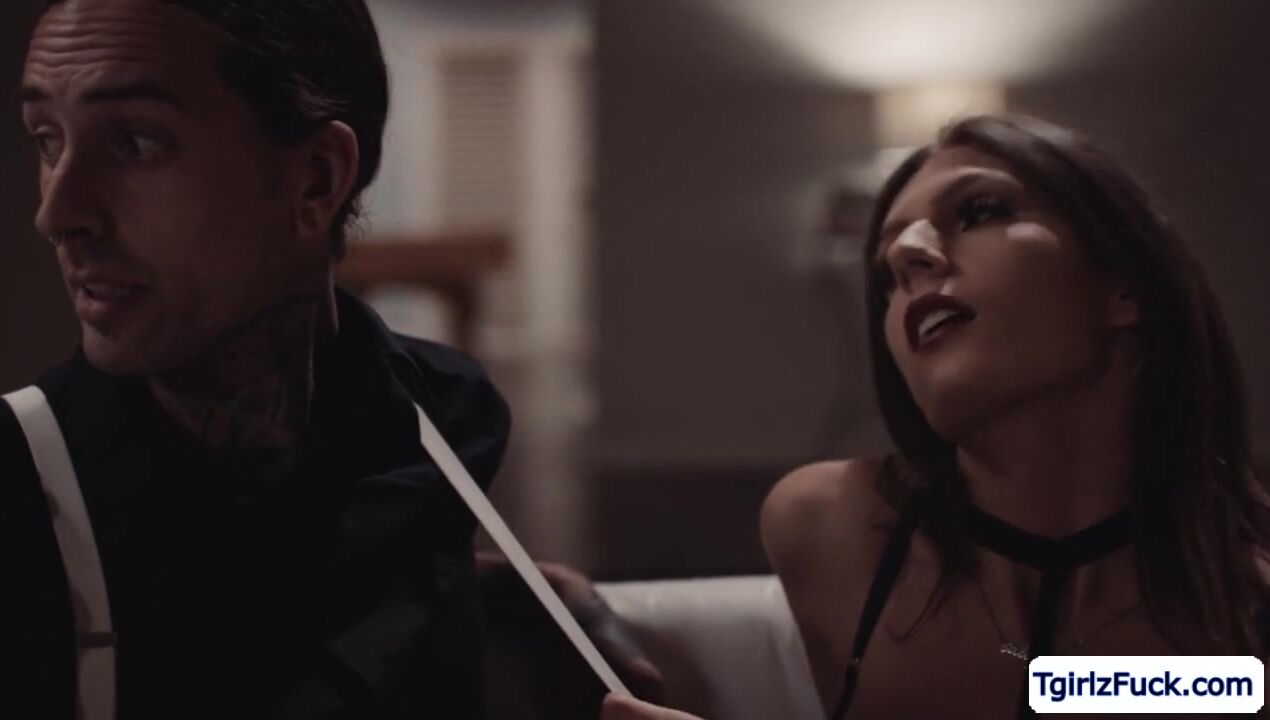 Busty brunette shemale Jade Venus kisses hunk stud in the couch and bows down to give it a deepthroat blowjob. In return,he gives her big ass a rimjob and hardcore bareback doggystyle while she masturbates her huge tranny dick.