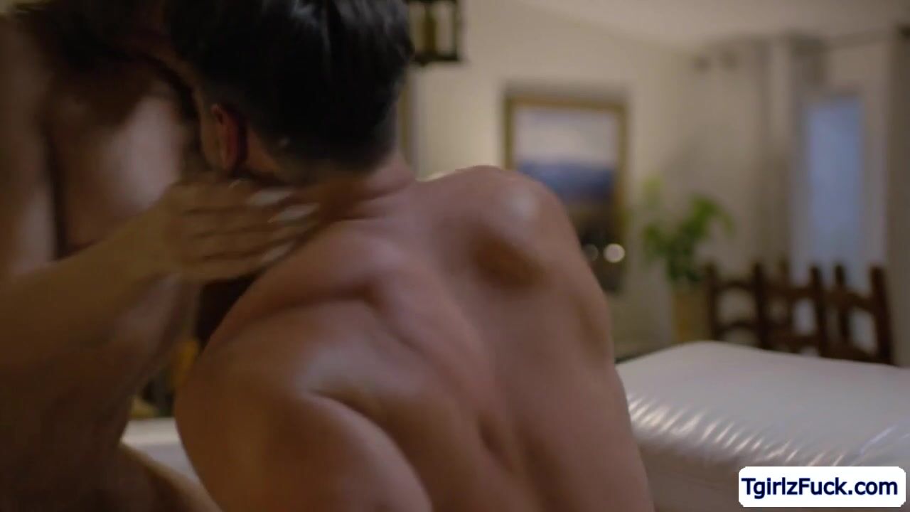 Brunette tbabe Jade Venus sits with hunk dude in the couch kisisng him while caressing his bigcock. The dude gives her a tit suck and then she grabs his dick for a deepthroat blowjob. The big tits tgirl gets anal barebacked and in return she fucks his ass.
