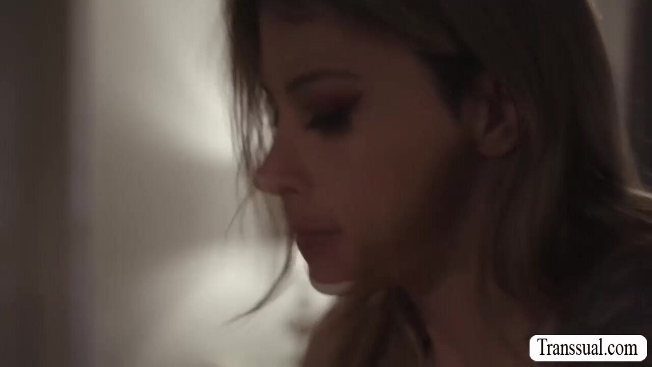 Tattooed babe comforts the shemale girlfriend of her stepbro by kissing her and sucking her tranny cock on the couch passionately.In return,busty TS licks the pussy of boyfriends stepsister and she then fucks it so deep and hard.
