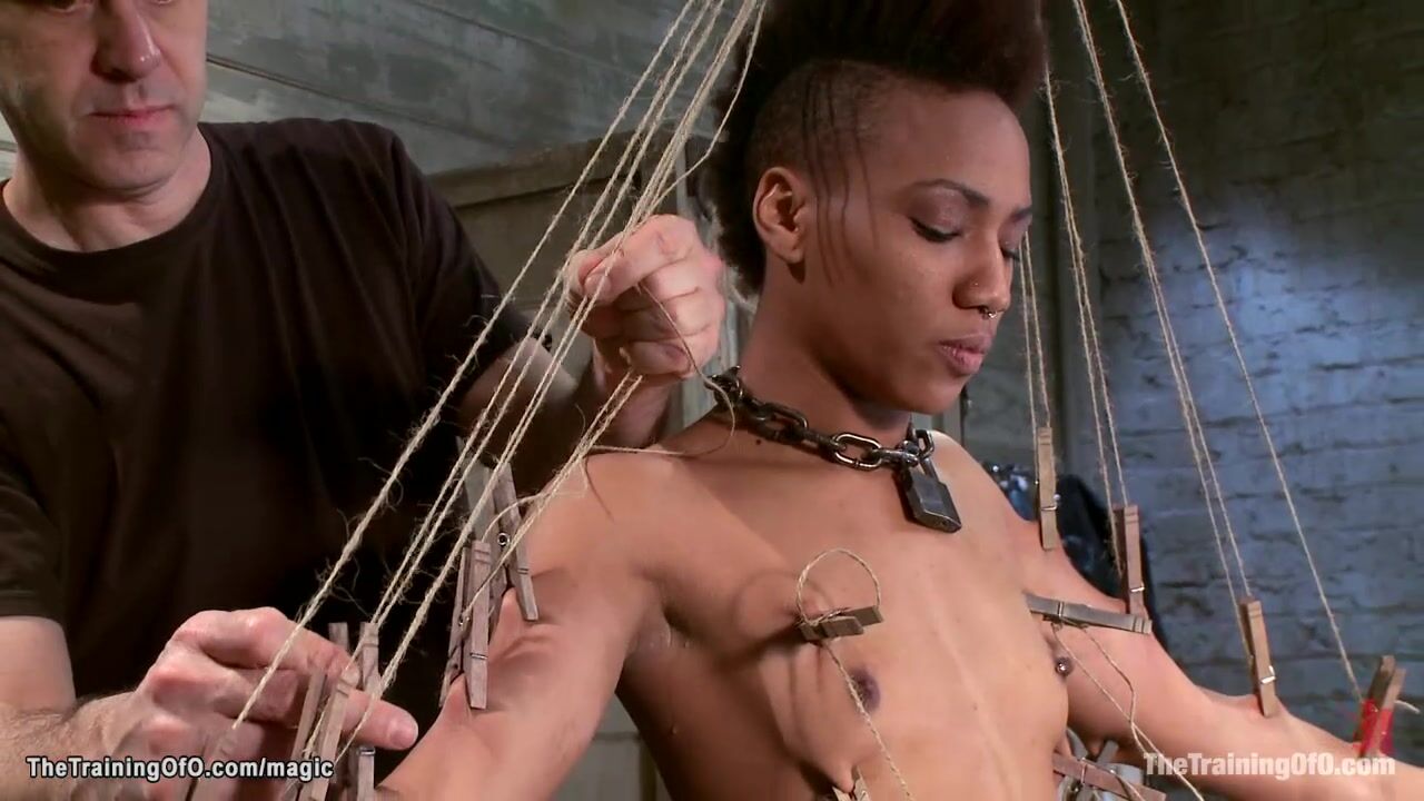 Description: Skinny ebony small tits slave trainee Nikki Darling bound in a web od zippers by master James Mogul then rides big dick gimp Rob Blu