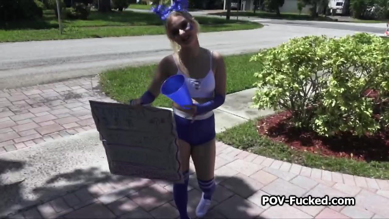 Description: Blonde fucktoy from next door is raising money for her team in a very special way. She even rides my hard dick outdoors to get paid big time!