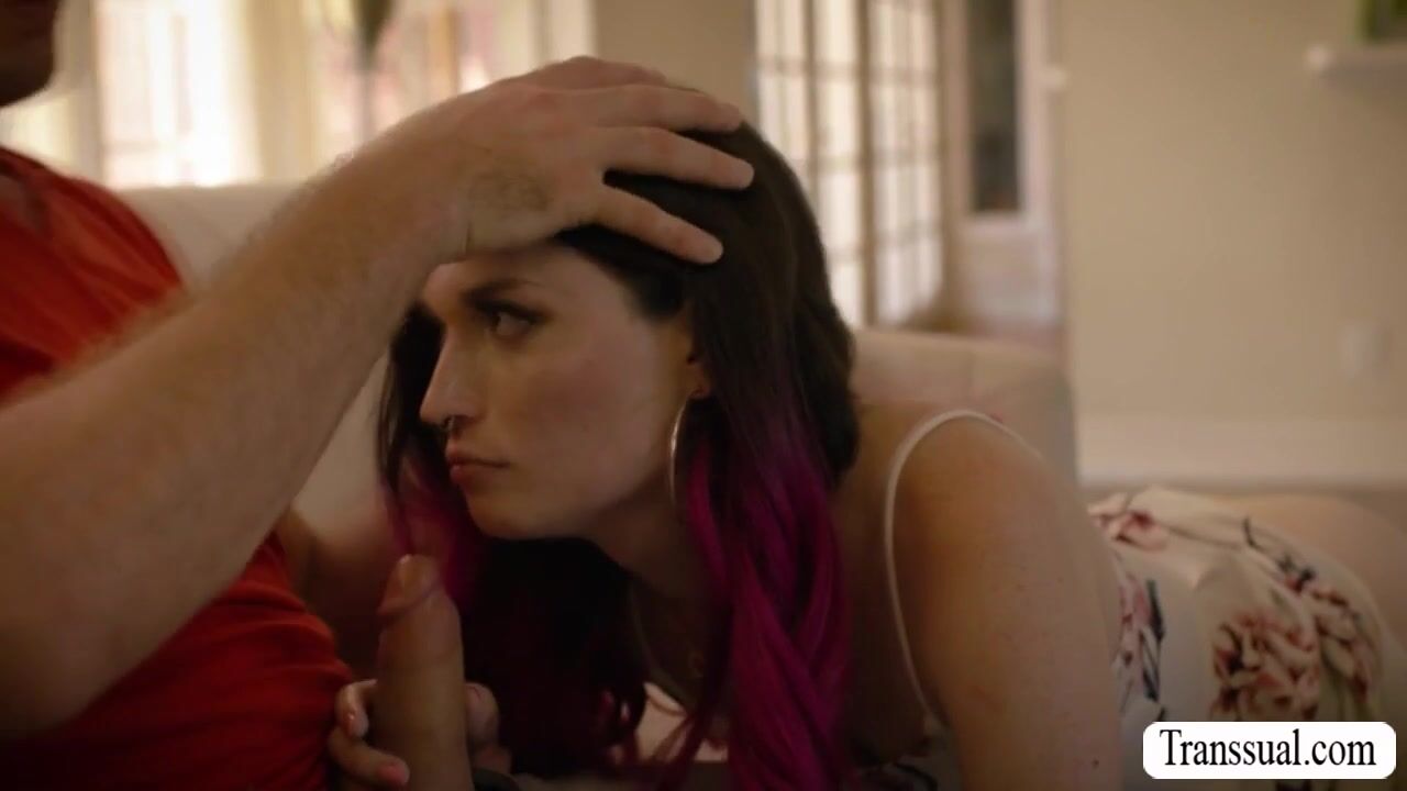 TS redhead meets her handsome stepbrother after many years did not see each other.After that,they start kissing each other and she then throats his big cock passionately.In return,stepbrother licks the ass of his shemale stepsister so hard.