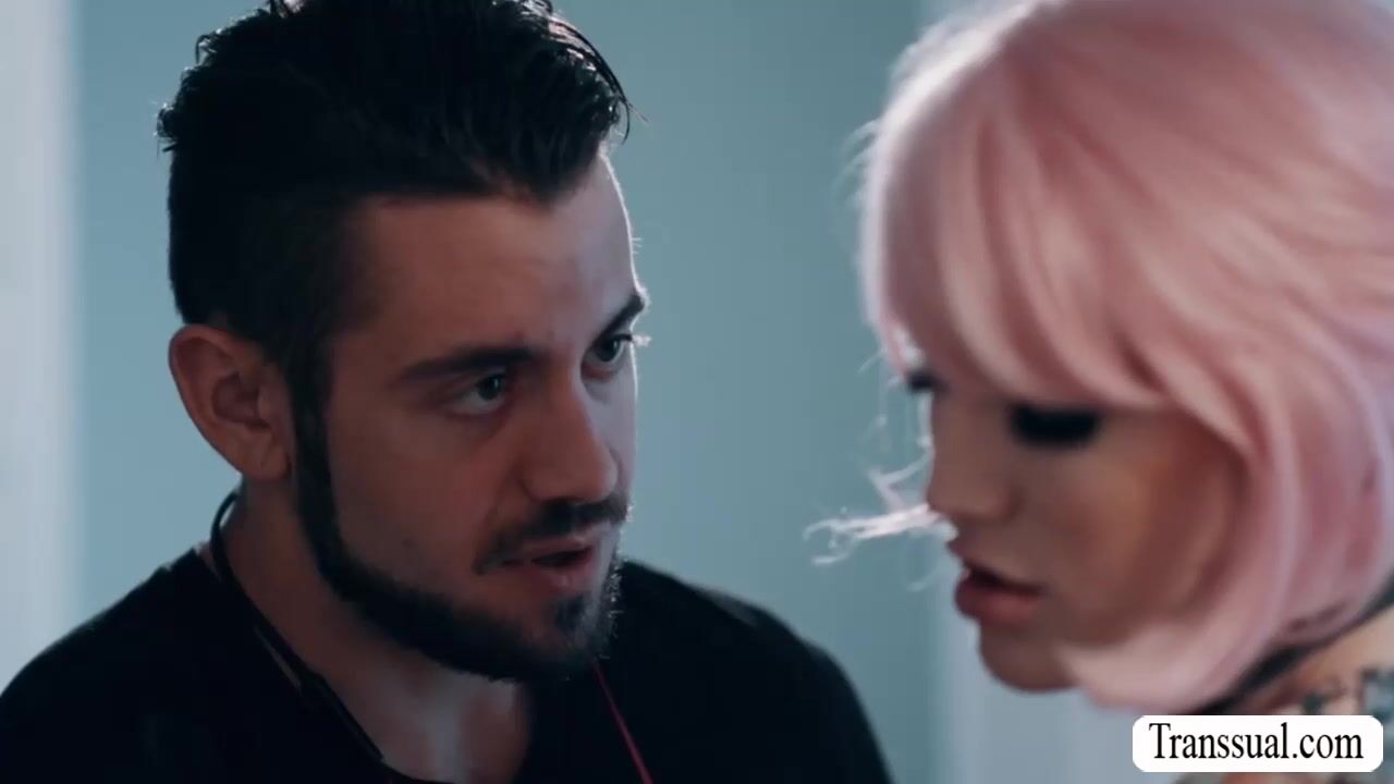 Busty pink haired shemale comforts her sad stepbrother by kissing her and sucking his big dick passionately.In return,her stepbrother gets naked and he then bareback fucks her tight wet ass so deep and fucking hard.