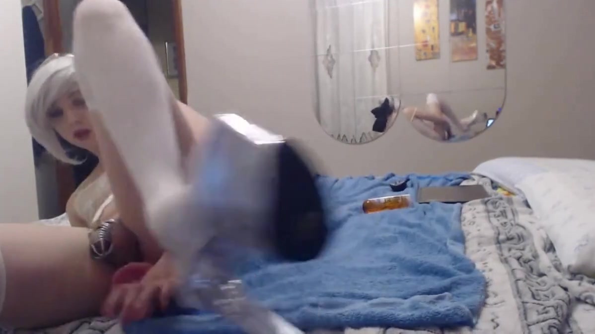 Description: Rear view of her porking her anus with a dildo, then she frees her wiener from the cage...