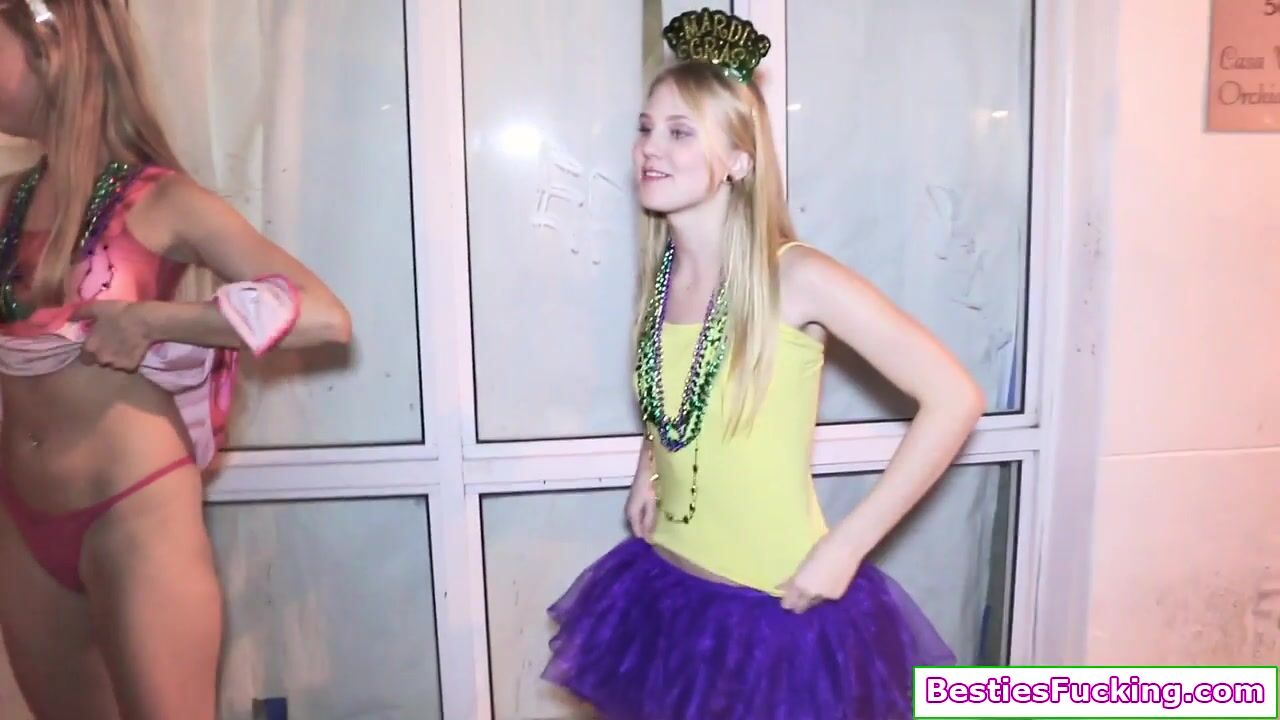 Three blonde teen bffs hang out with two guys.They flash their small tits then go for a public blowjob.They go to their apartment where they get naked,deepthroat and take turns fucking them while licking the others shaved and hairy pussy.