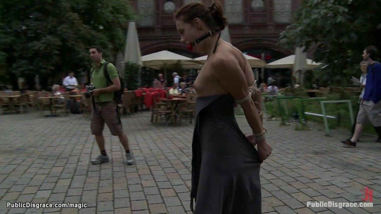Description: Hot German brunette slave Black Lady is humiliated and gagged and bound in public for onlookers then throat fucked by big dick Tommy Pistol
