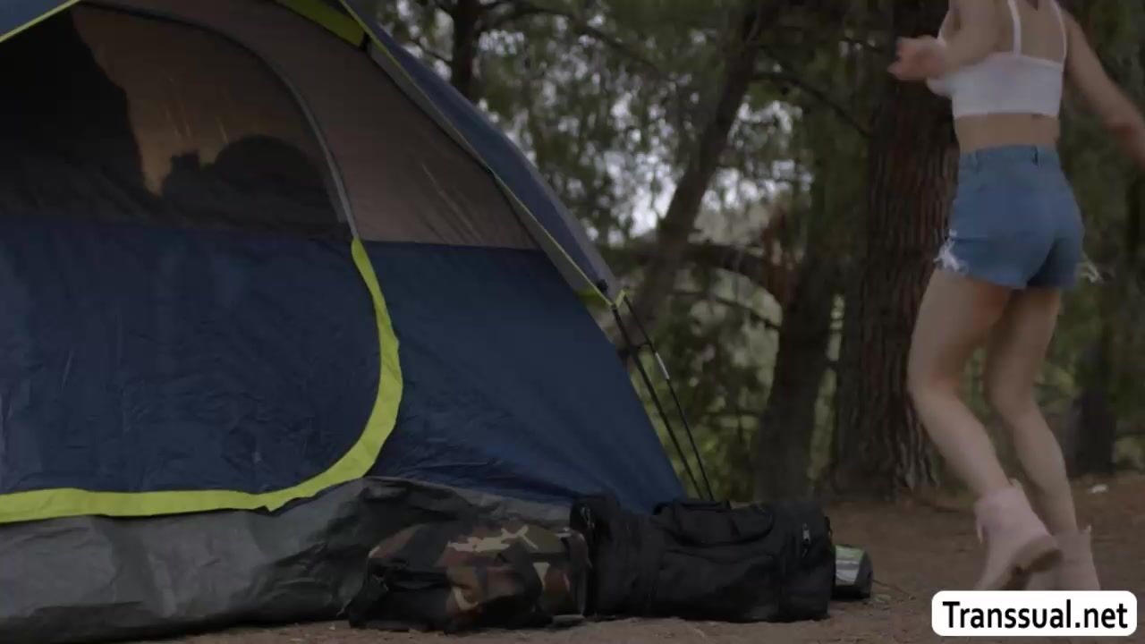 Slut babe toys her wet pussy in the tent a stranger guy puts his dick on the hole of the tent.After that,horny babe sucks it and then her shemale friend arrives and they start fucking their wet pussies and asses in threesome way.