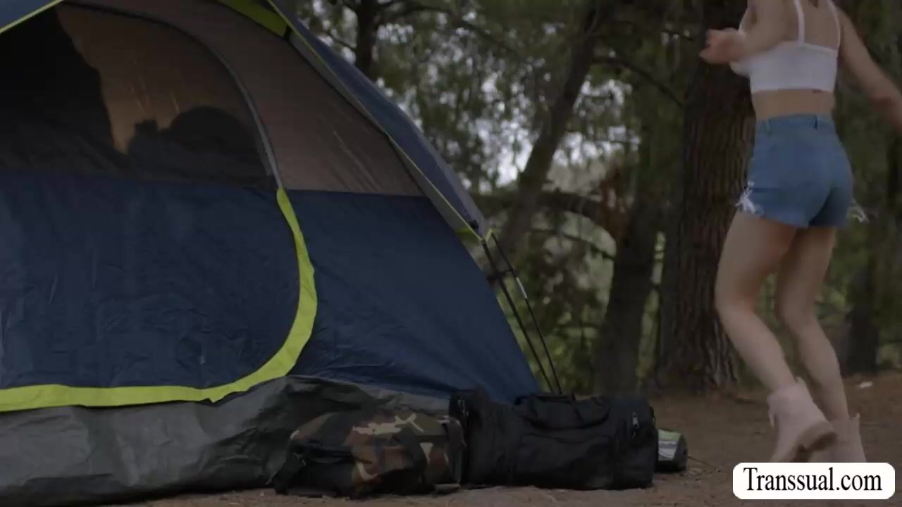 Horny babe toys her wet pussy in the tent a stranger guy puts his dick on the hole of the tent.After that,horny babe sucks it and then her shemale friend arrives and they start fucking their wet pussies and asses in threesome way.