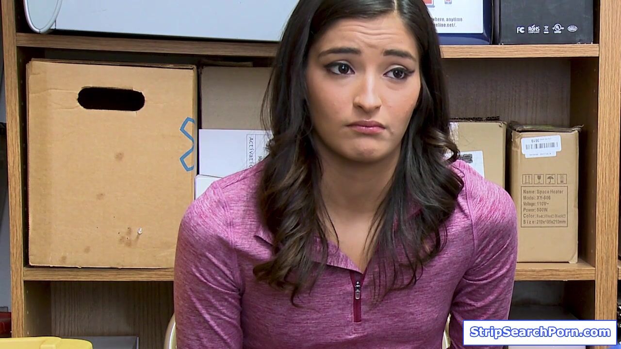 A security officer confirms that the brunette teen he caught is a shoplifter.He orders a strip search, getting her bra and panties removes.The petite babe cooperates,blowjobs his big cock.He masturbates her clit then fucks her shaved pussy.