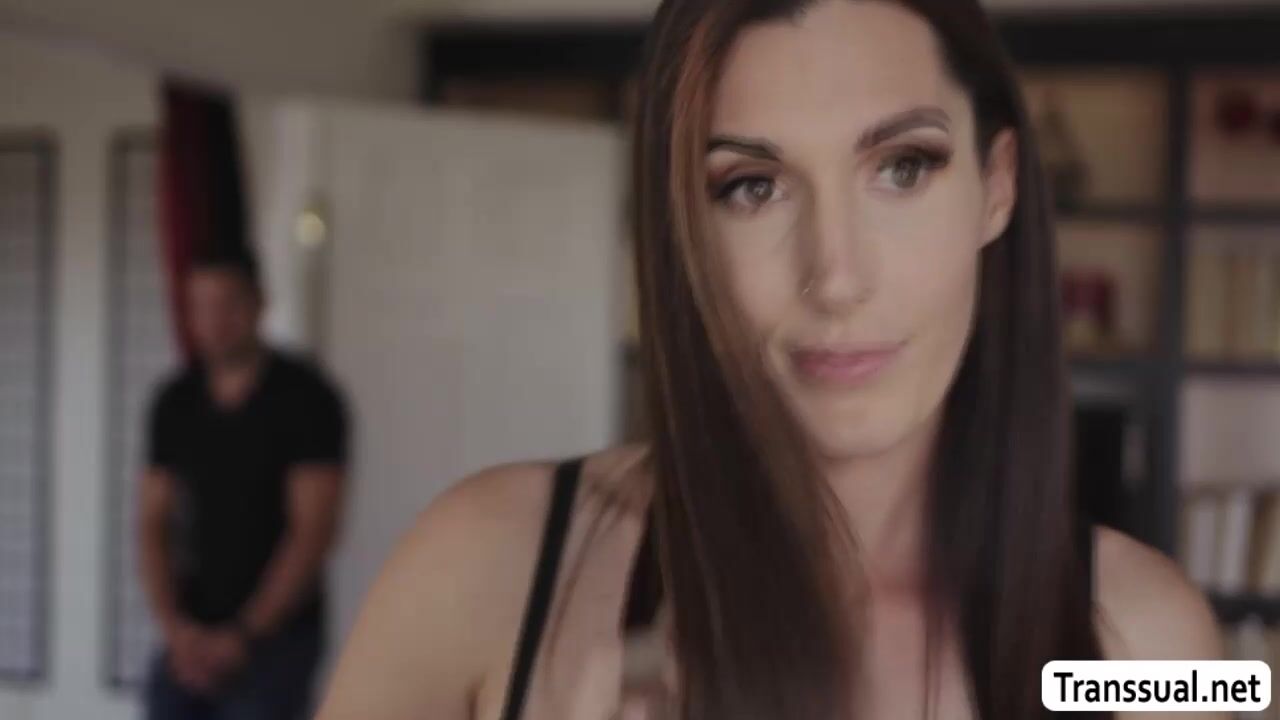 Milf TS seduces her handsome stepson to have sex with her instead of going to the party.She starts kissing him and she then throats his hard big cock passionately.In return,her stepson bareback fucks her tight wet ass so deep and hard.