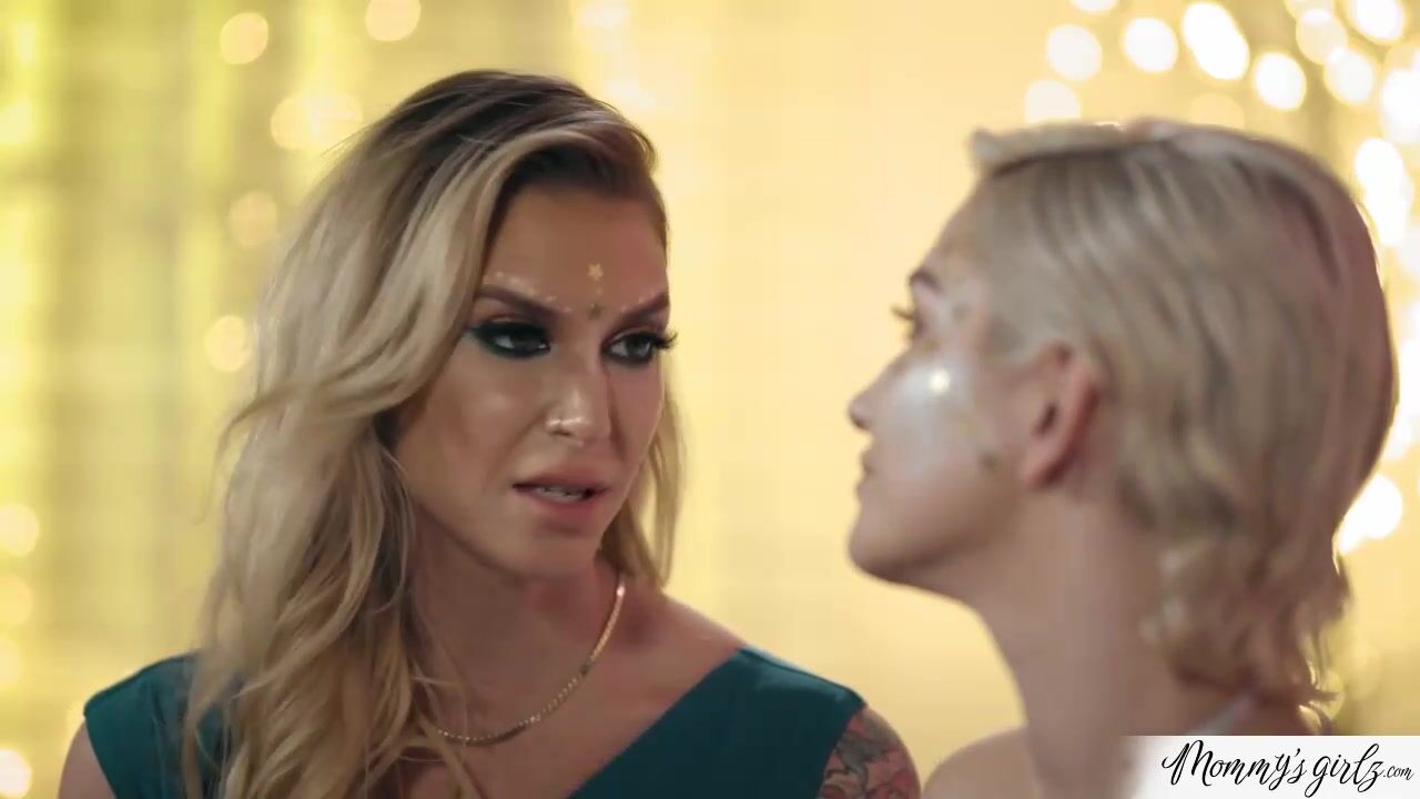 Busty tattooed stepmom Brooke Banner is talking to her lesbian stepdaughter Skye Blue.The big tits milf and the teen start to kiss and titsuck each other.The horny babe licks and fingers the cougars pussy.They switch to 69 positions until they reach their orgasm.