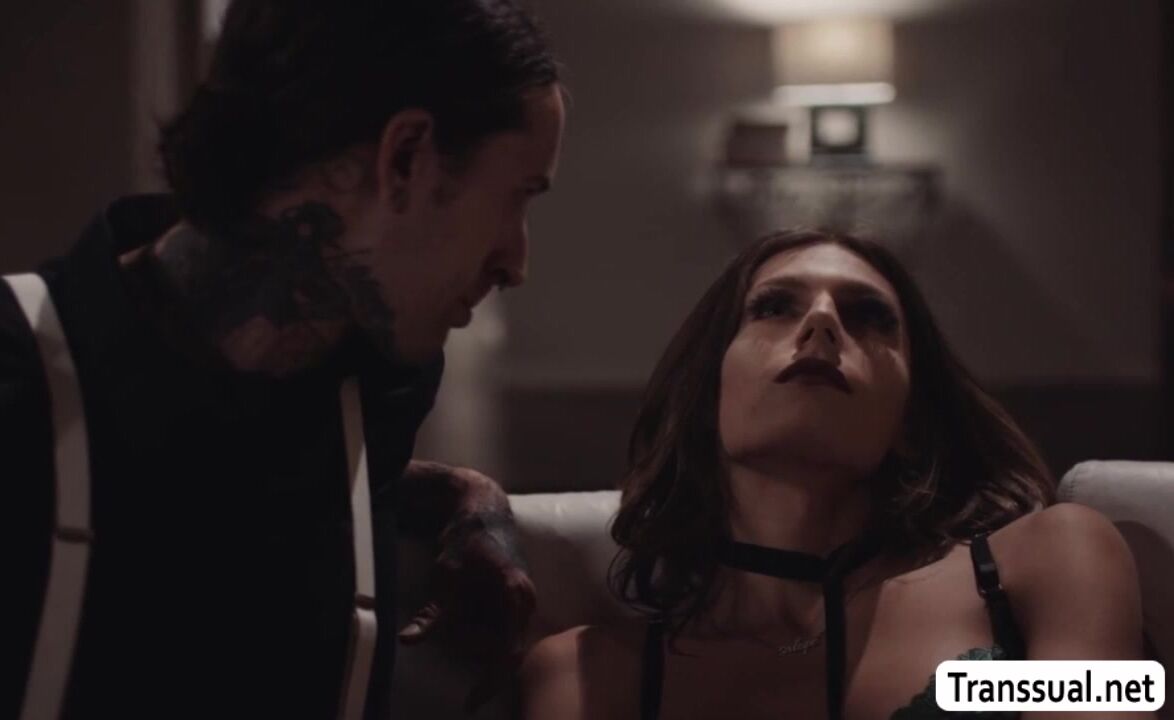 Description: Curvy shemale lets her handsome boyfriend wait on the couch while shes wearing a seductive lingerie.They start kissing each other on the couch and she then throats his hard big cock passionately.In return,her boyfriend bareback fucks her wet ass.