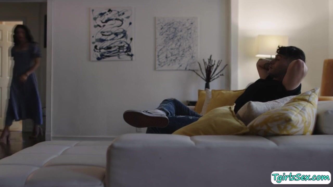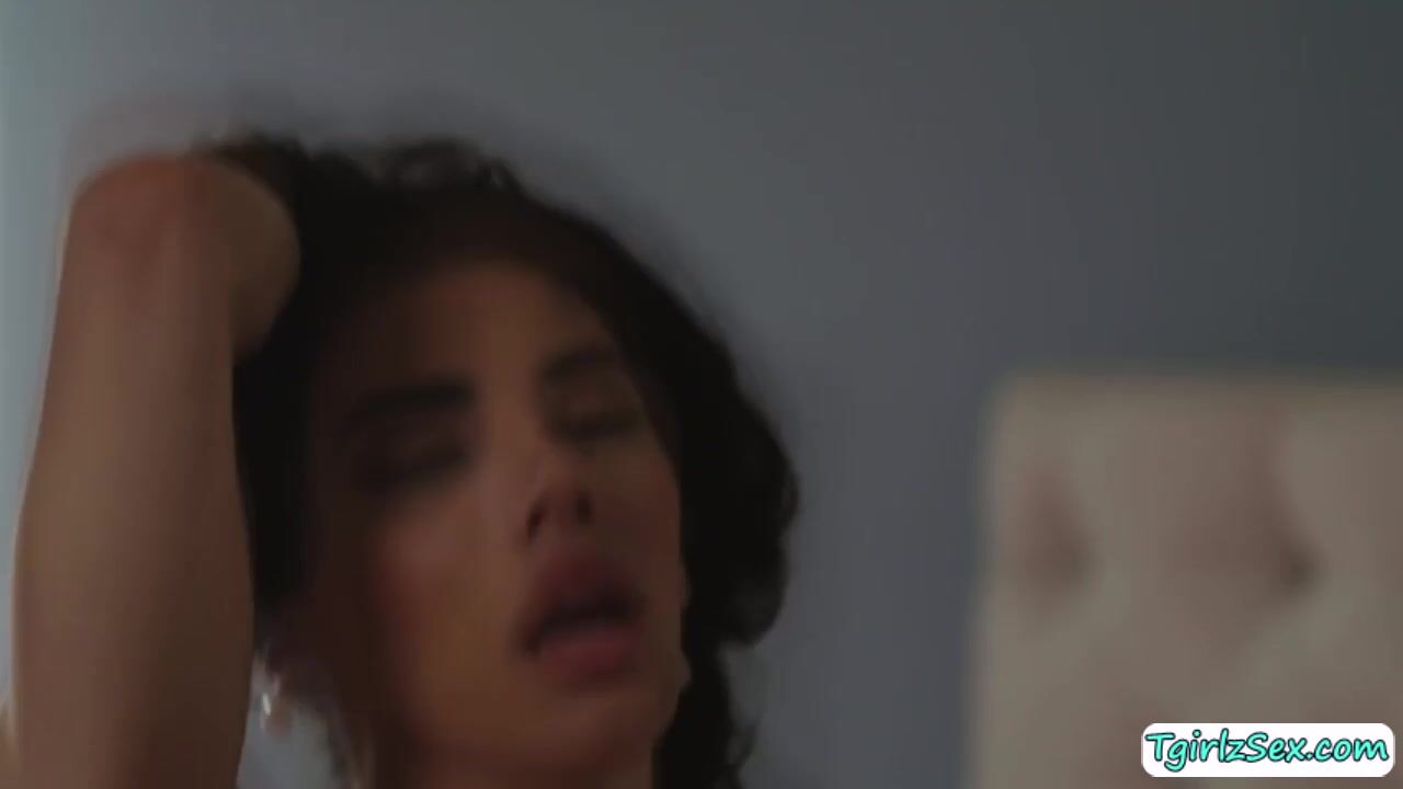 Brunette small tits shemale Ariel Demure striptease lingerie flirting with hunk stepbro in bed. The skinny tbabe whips out his big cock for a deepthroat blowjob while masturbating big tranny cock then bends over to straddle her big ass with hardcore anal bareback.