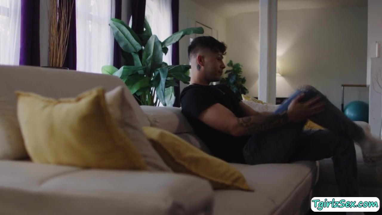 Description: Brunette small tits shemale Ariel Demure striptease lingerie flirting with hunk stepbro in bed. The skinny tbabe whips out his big cock for a deepthroat blowjob while masturbating big tranny cock then bends over to straddle her big ass with hardcore anal bareback.