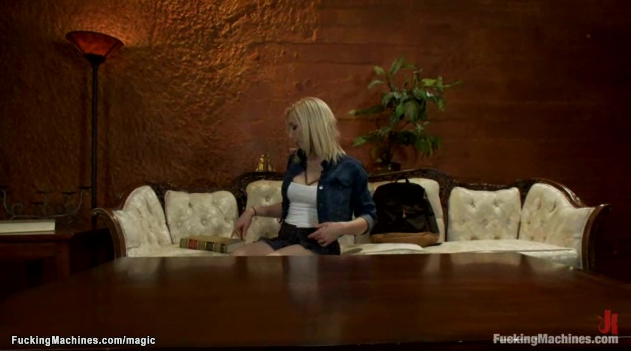 Description: Solo blonde babe Rylie Richman with nice pair of tits stripping off then laying on the couch and fucking machine then continue fucking on the coffee table