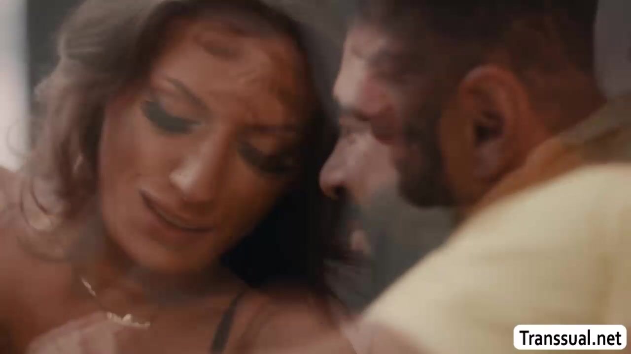Curvy trans babe is on her bed using her cellphone.After that,her fat stepdad arrives and they start kissing each other.Next is,she lets him suck her shecock passionately and licks her ass before he bareback fucks it so deep and hard.