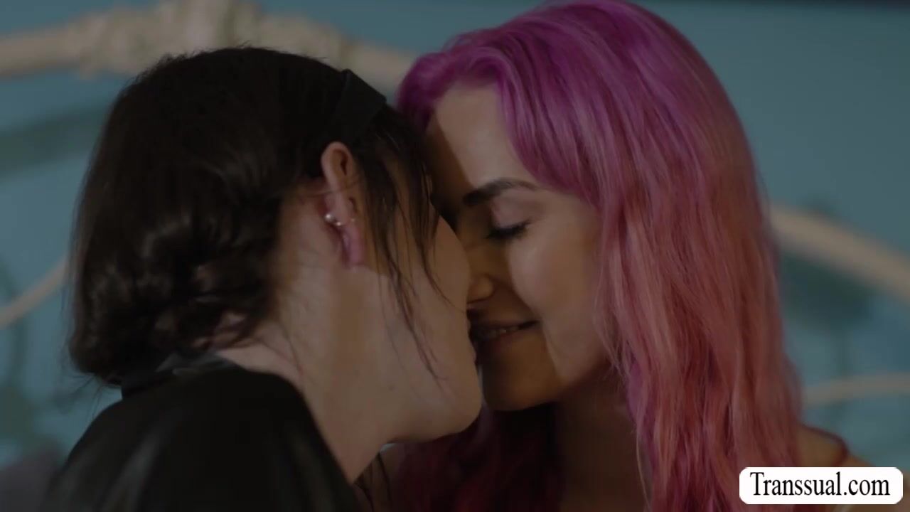 Seductive babe gets her wet pussy banged by busty shemale Video