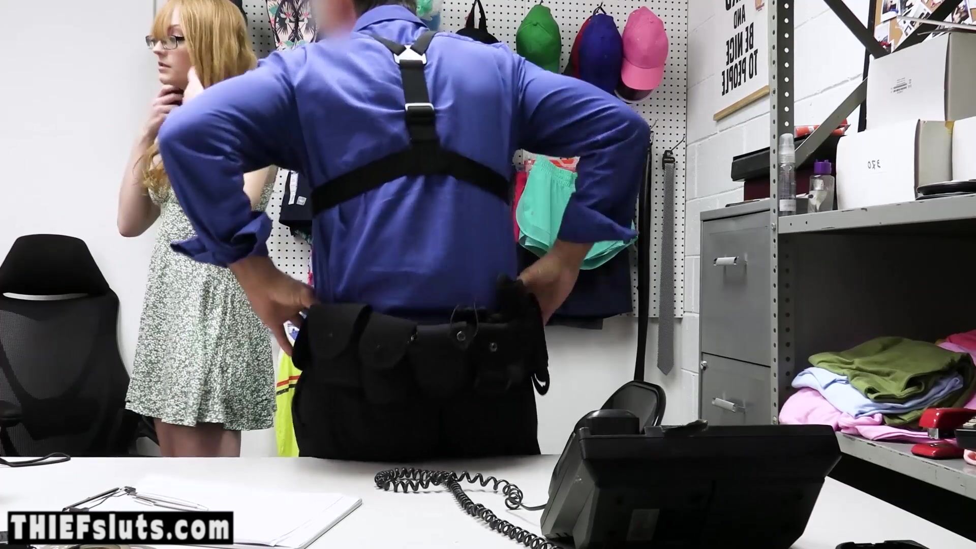 Passionate redhead teen shoplifter Amber Stark with small tits in glasses questioned by a dirty LP officer who checked her shaved pussy too then he ordered her to suck and fuck his big dick to avoid jail